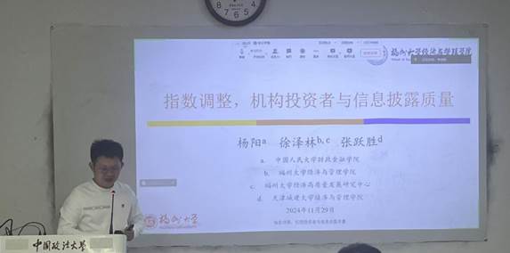 在讲座的主旨报告环节,徐泽林副教授围绕《指数调整、机构投资者与上市公司信息披露质量》这一论文进行了专业的讲解,聚焦于如何写出一篇优秀的学术论文,从论文写作的假设设计、数据搜集与处理、实证分析等多个方面进行了深入浅出的介绍。徐老师首先从论文写作的背景入手,阐述了他关于如何找到学术论文写作的出发点与关键问题的方法。他提到,学术论文的选题应从经济发展的实际需求出发,切实贴合中国独具特色的资本市场性质,符合当下最新政策要求。接着,徐老师深入探讨了学术论文中如何高效寻找研究样本、设计实证模型,并以自己的论文为例为同学们详细解释了变量的选择、计算公式的运用等细节的学术论文写作方法。